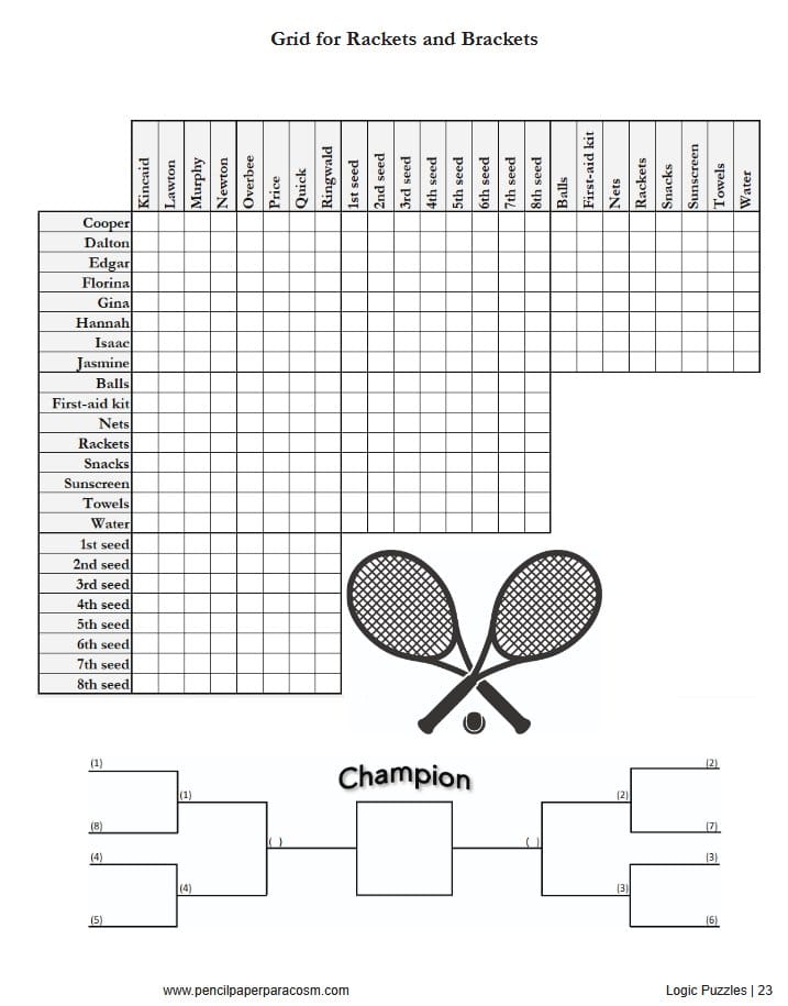The design was inspired by one of my most convoluted logic grid puzzles ever published. Mind-bending Variety Puzzles Volume 2 has a puzzle called Rackets and Brackets: