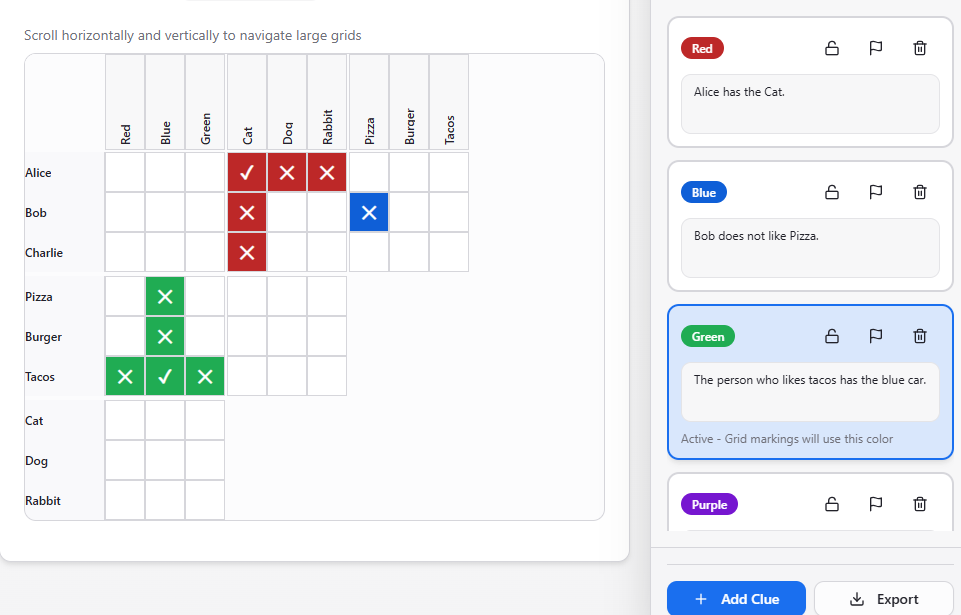 Even though this puzzle doesn't use a grid, I found the clue tracker helpful. In every logic puzzle construction, the goal is to provide just enough clues to ensure that the puzzle can be solved. I always reach a point where just one more piece of information is required. I have to decide whether to add another clue or beef up an existing clue.