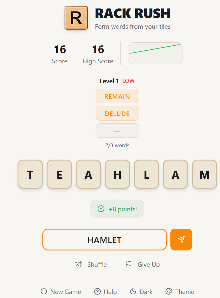 Give your brain a workout with Rack Rush, an addictive word unscrambling game. On the first six levels, take as much time as you need to find the longest word on your rack. As you level up, you get fewer points for shorter words. Watch out for the 30-second countdown timer!