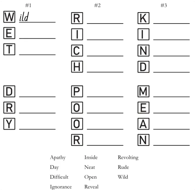 Antonyms are words that have opposite meanings. For example, hot and cold, or good and bad. Each puzzle has pairs of antonyms listed in a vertical column. Below the puzzles is a pool of words that can be added to one row in one puzzle, and each word from the pool has the same starting letter. Before placing a word, you need to think of an antonym that starts with one of the unused letters in the same column.