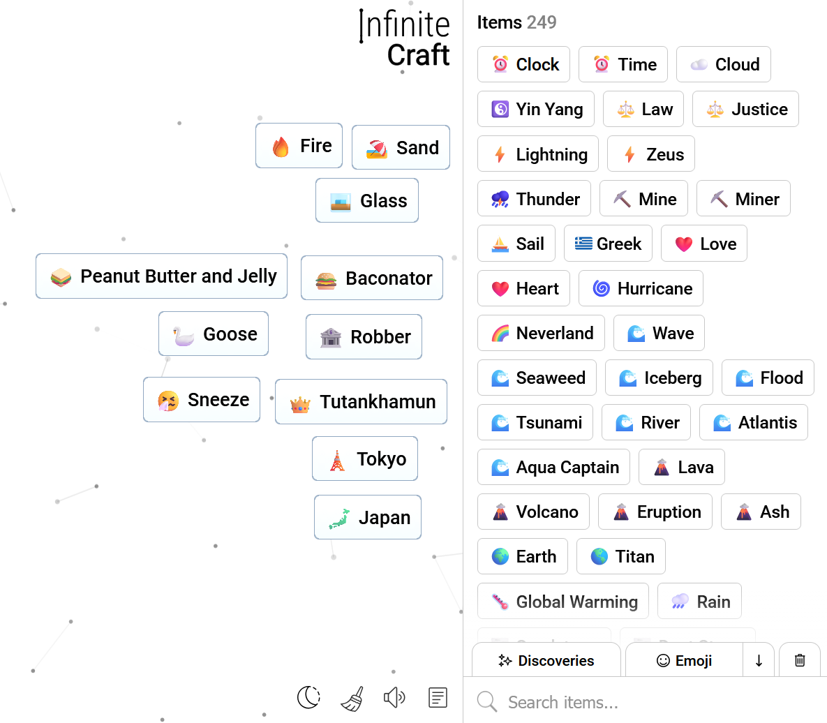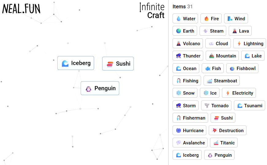Amazingly, you start with just four elements. As you combine them in different ways, you start to get a sense of what should happen. However, the AI doesn't always cooperate so, if you stick with it long enough, you figure out different ways to craft the desired object. For example, after creating just 27 items, I was able to make a penguin by combining an Iceberg with sushi!